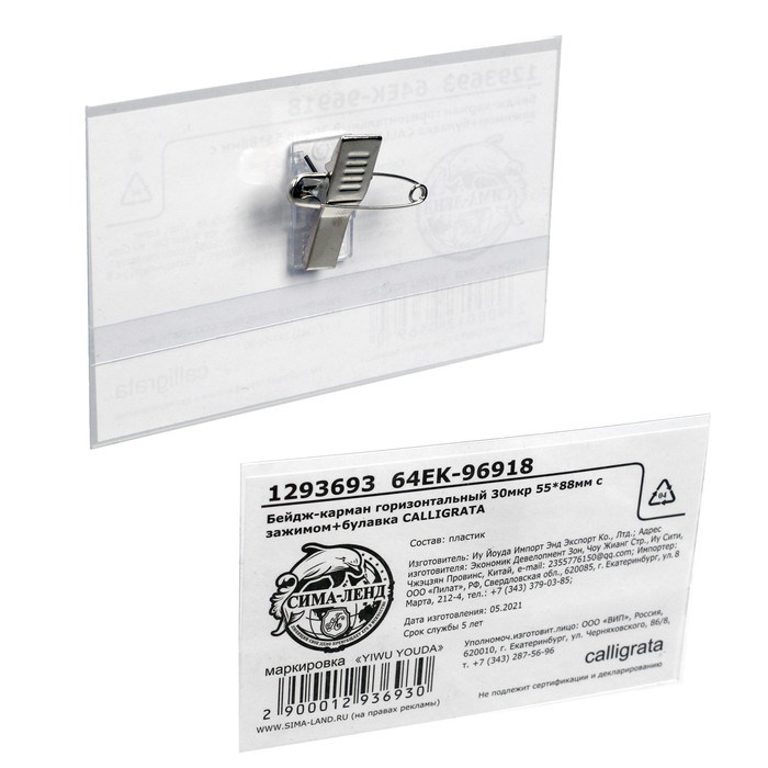 Бейдж-карман 30мкр 55*88мм с зажимом+булавка