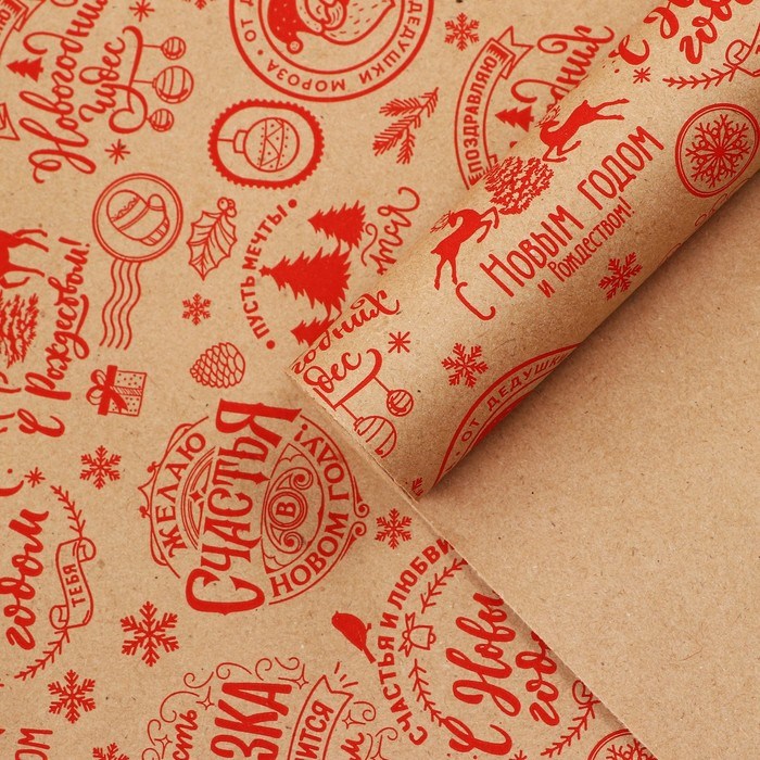 Бумага крафтовая в рулоне «Желаю счастья в Новом году», 0.68*7м