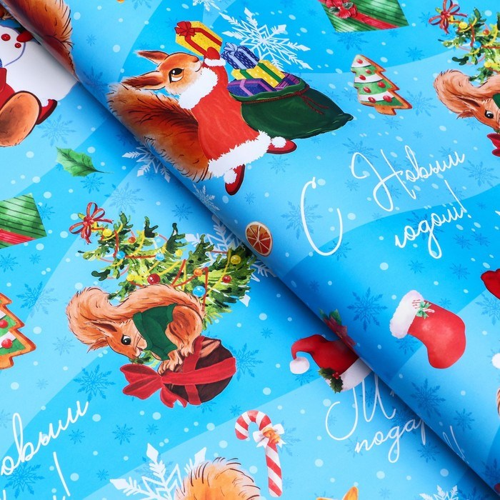 Бумага упаковочная новогодняя глянцевая «Белочки», 70*100см