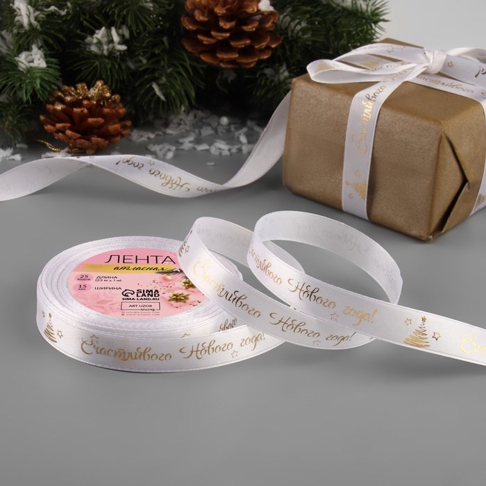 Лента атласная с тиснением «Счастливого Нового года!», 15мм, 1м, белая
