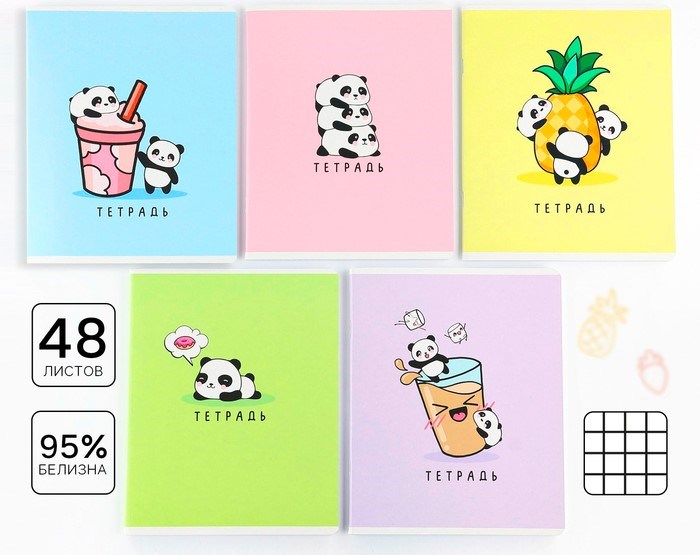 Тетрадь в клетку, 48л, А5, на скрепке, «Панды» МИКС 1шт